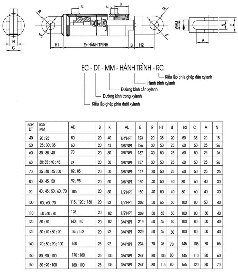- Bản vẽ và thông số kích thước xy lanh kiểu lắp EC-RC
